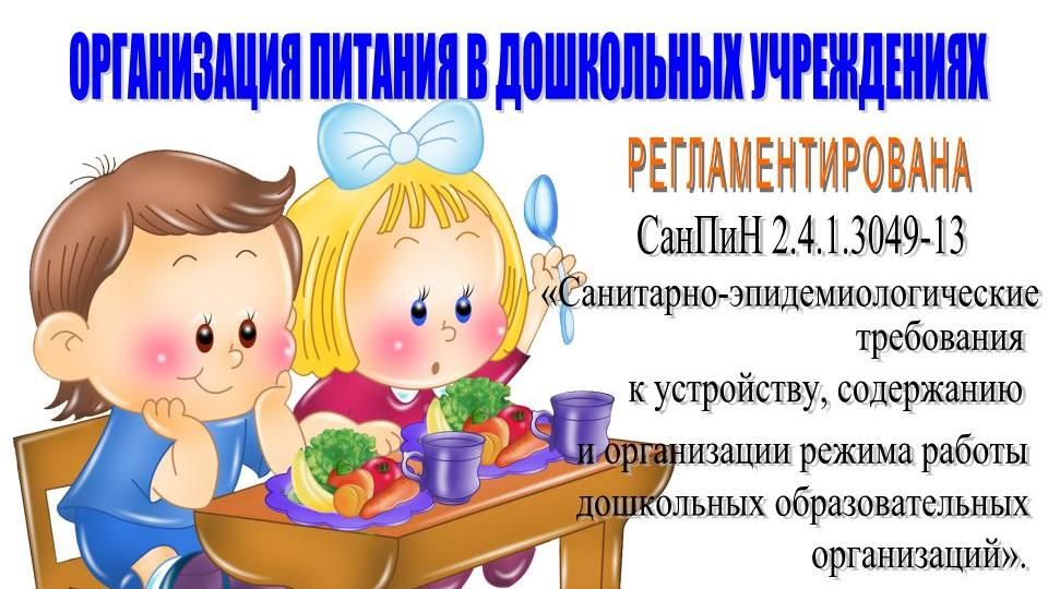 Питьевой режим в детском саду проводится в соответствии с требованиями СанПиН. Питьевая вода доступна воспитанникам в течение всего времени нахождения в саду. Ориентировочные размеры потребления воды ребенком зависят от времени года, двигательной активности ребенка. Организация детского питания напрямую связана со столовым этикетом. Знакомство с ним позволяет ребенку быть уверенным в себе, правильно вести себя за столом, умело пользоваться столовыми приборами, быть обходительным в застольном общении.